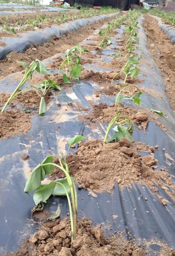 - 묘를 수평으로 눕혀서 심습니다. 수직으로 심으면 고구마가 너무 깊게 자라거나 크기가 작아질 수 있습니다.
