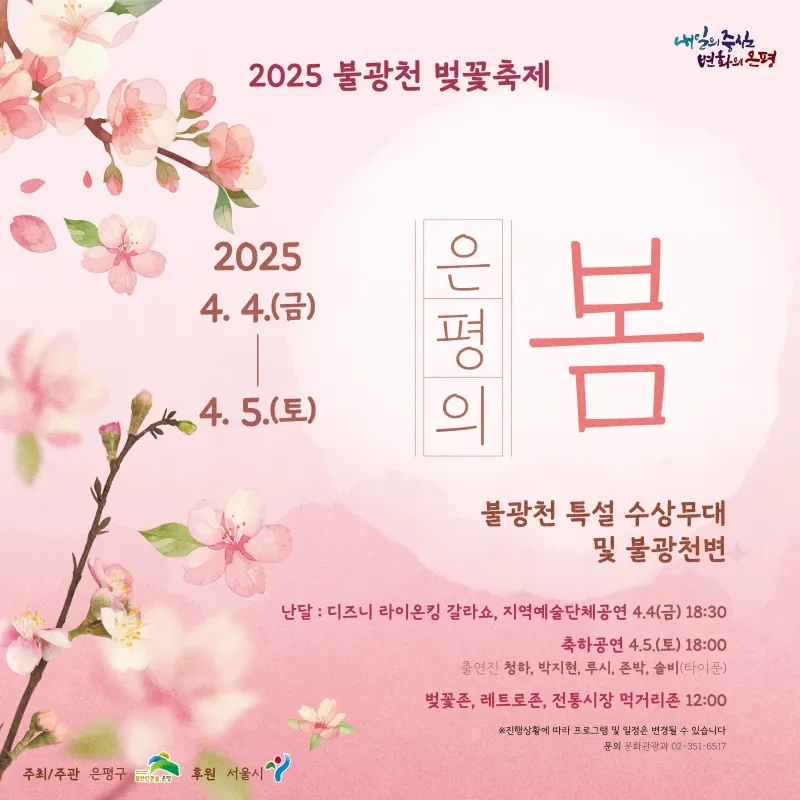 2025 불광천 벚꽃축제에서는 벚꽃 구경뿐만 아니라 다양한 볼거리와 즐길 거리가 마련되어있습니다.